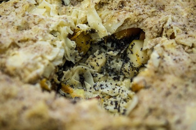 A tűzálló tálat vajjal kikenjük, belehelyezünk egy réteg tésztát, amit megszórunk sütőtök és almakockával, meghintjük mákkal és befedjük tésztával.